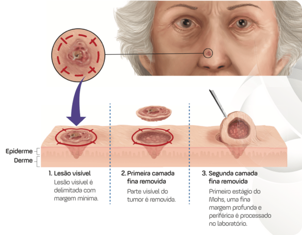 Apenas quando todas as margens profundas e periféricas estiverem livres no exame microscópio é que os pontos são dados para fechar a ferida cirúrgica. Por vezes é necessário retalho ou enxerto cutâneo.